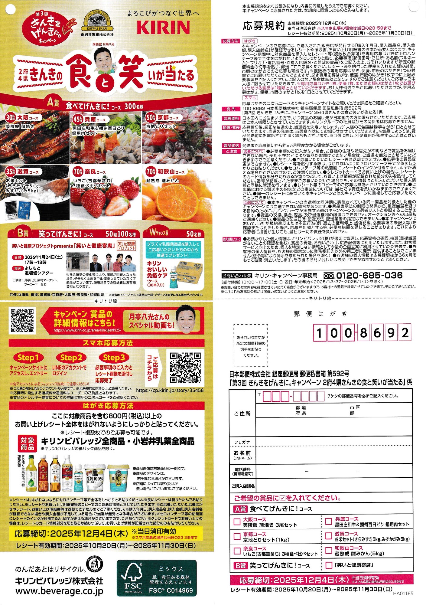 対象店舗(近畿エリア店舗) で対象商品(キリンビバレッジ、小岩井乳業 全商品) を1点以上含む合計800円(税込)以上購入したレシートでスマホまたはハガキ応募できます。