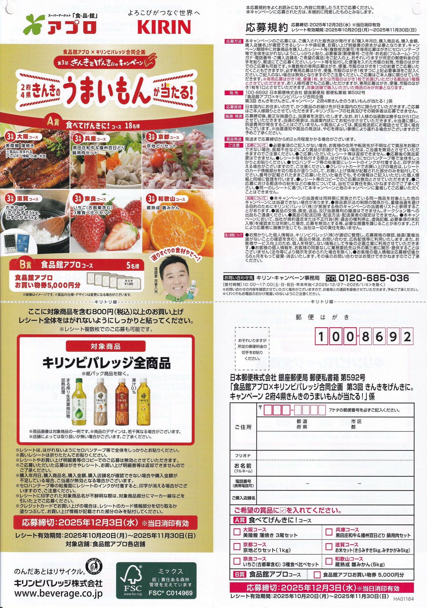 対象店舗(食品館アプロ) で対象商品(キリンビバレッジ全商品) を1点以上含む合計800円(税込)以上購入したレシートでハガキ応募できます。