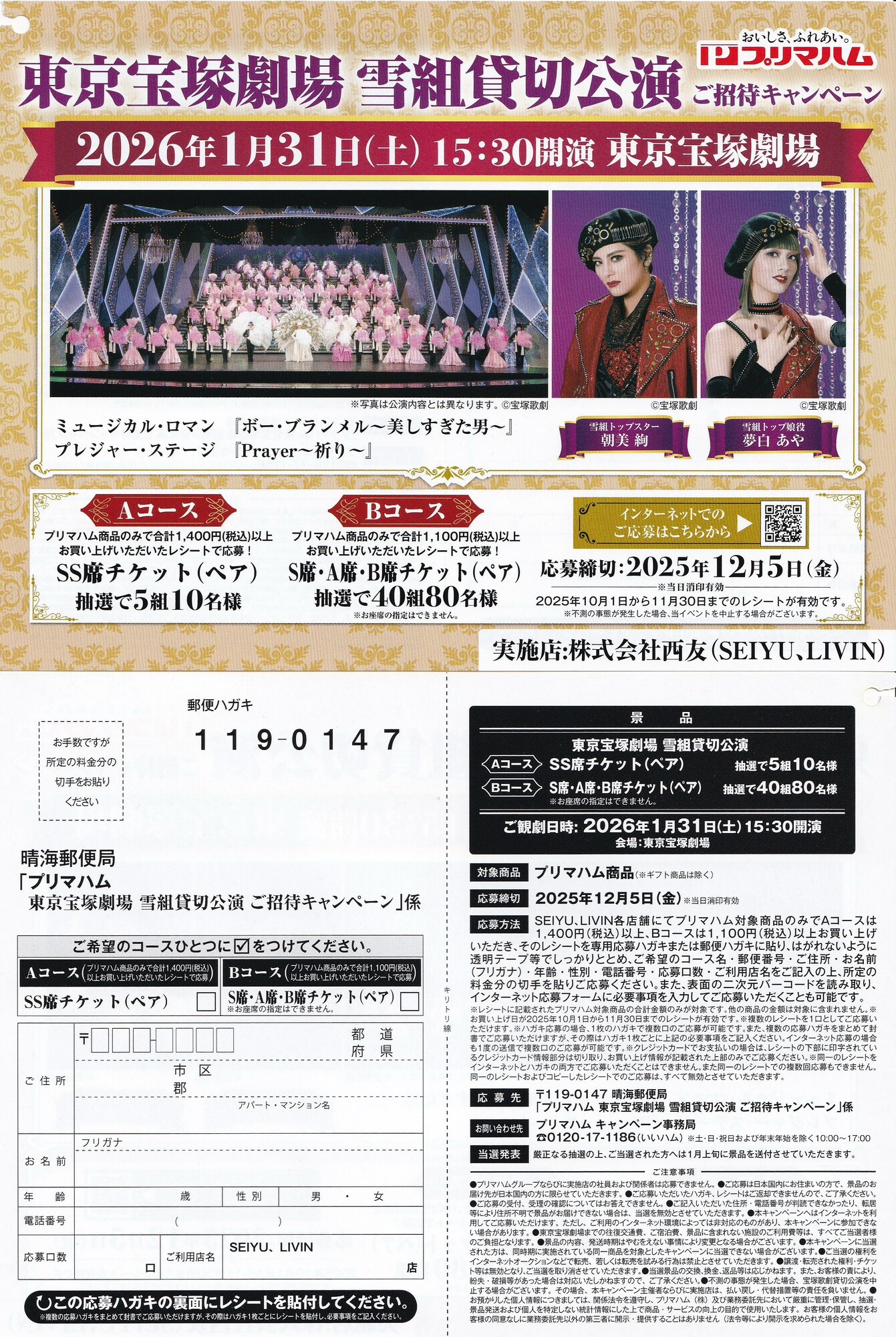 西友×プリマハムのクローズド懸賞「東京宝塚劇場 雪組貸切公演 ご招待キャンペーン」のご紹介です。