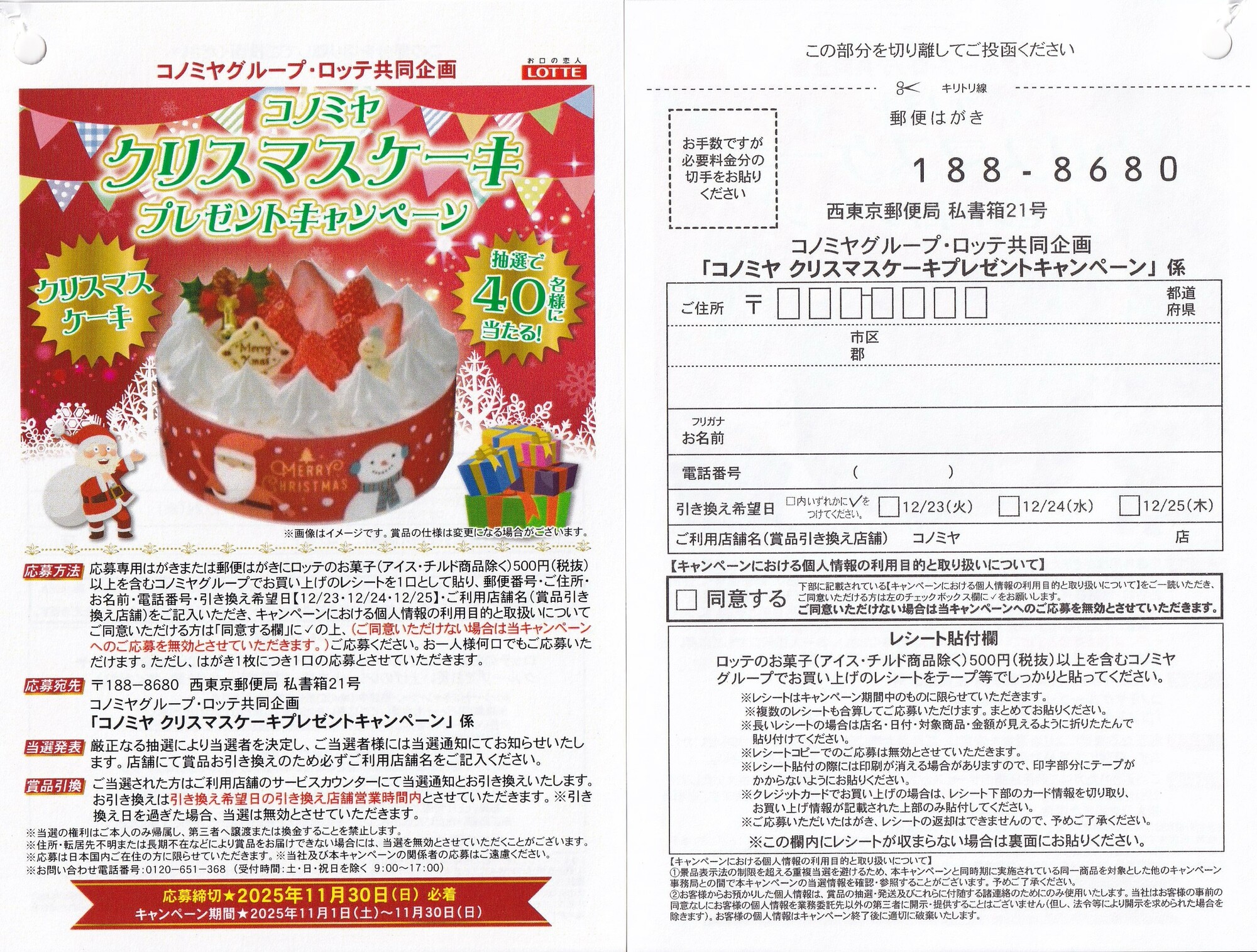 コノミヤ クリスマスケーキ 無料引換券が40名様に当たる!