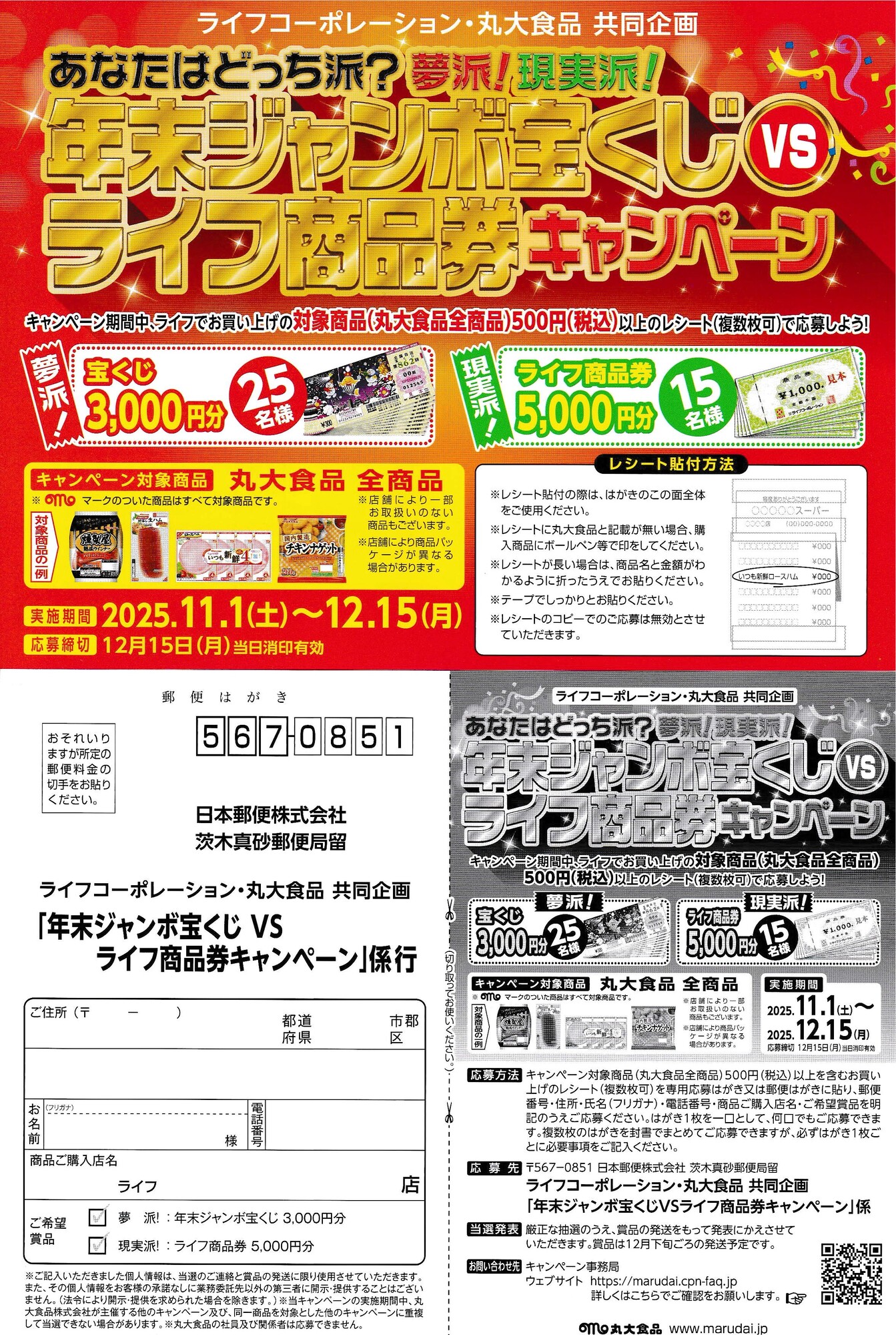 ライフ×丸大食品のクローズド懸賞「年末ジャンボ宝くじ VS ライフ商品券キャンペーン」のご紹介です。