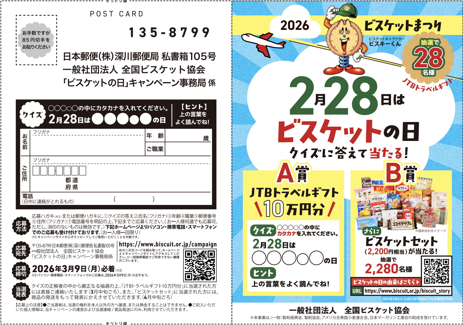 一般社団法人 全国ビスケット協会の懸賞「2026ビスケットまつり「ビスケットの日」キャンペーン」のご紹介です。