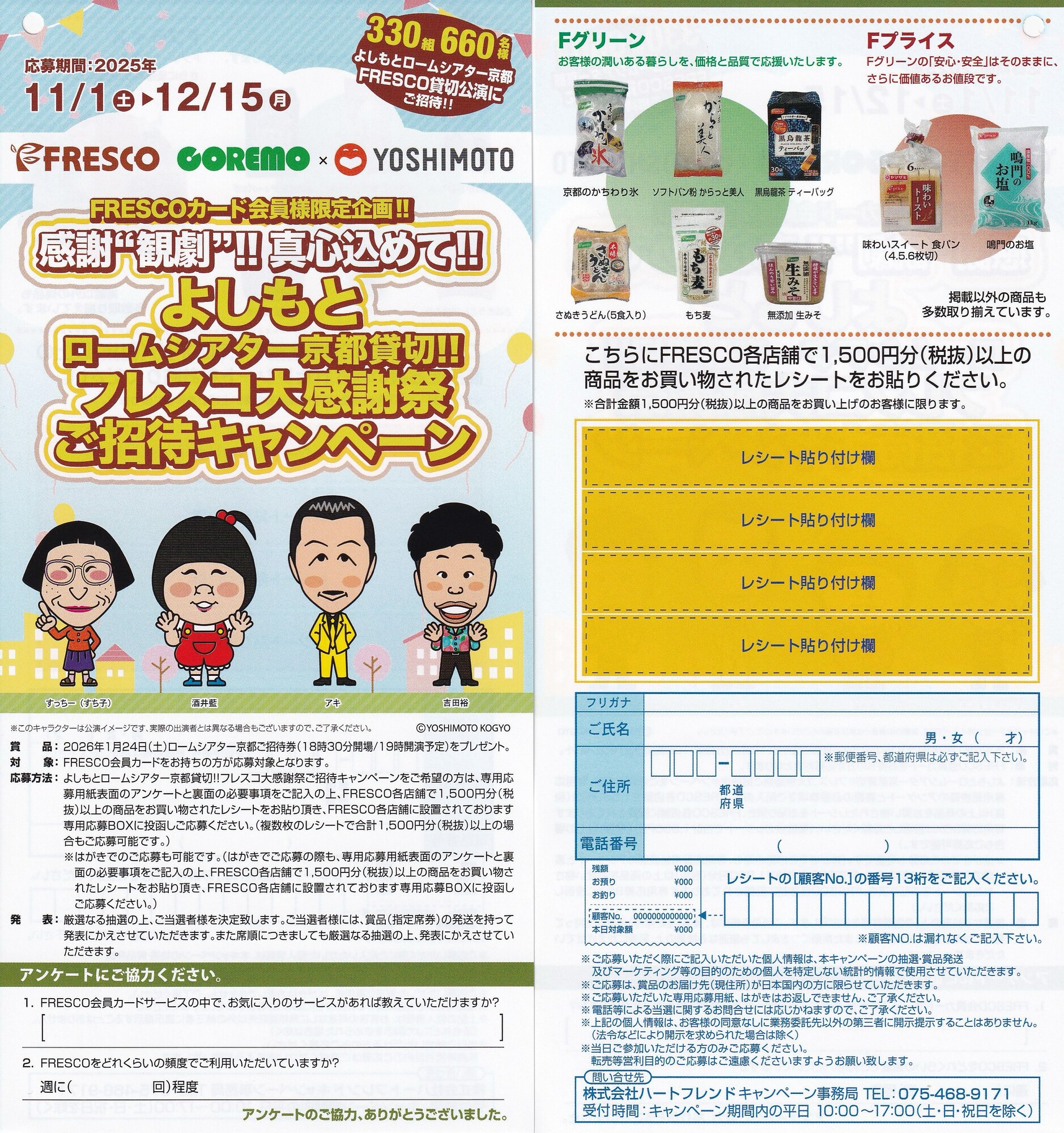 フレスコ×よしもとのクローズド懸賞「よしもとロームシアター京都貸切!!フレスコ大感謝祭ご招待キャンペーン」のご紹介です。