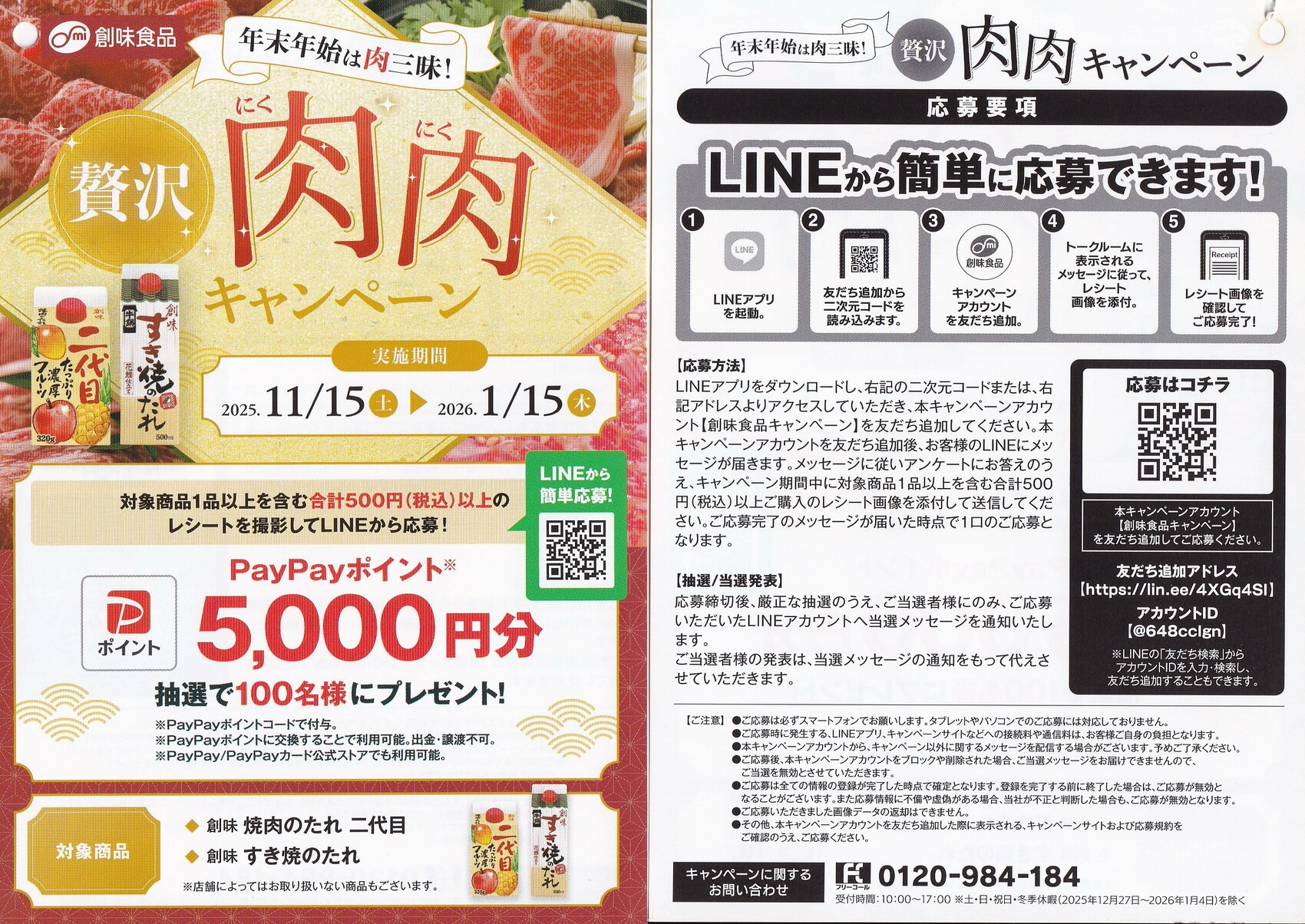 対象商品(創味 焼き肉のたれ 二代目、すき焼のたれ) を1点以上含む合計500円(税込)以上購入したレシートでLINE応募できます。