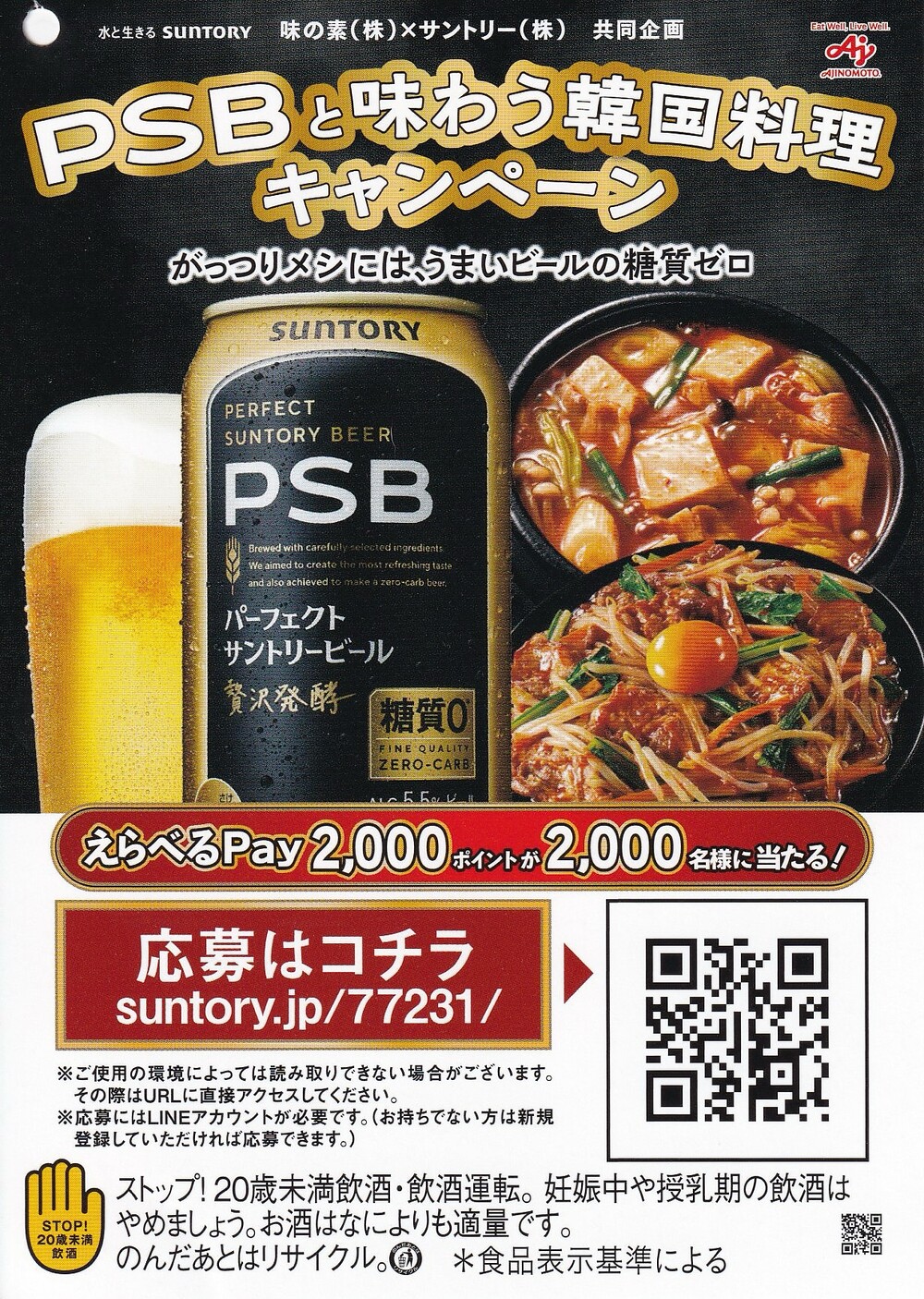 味の素×サントリーのクローズド懸賞「PSBと味わう韓国料理キャンペーン」のご紹介です。