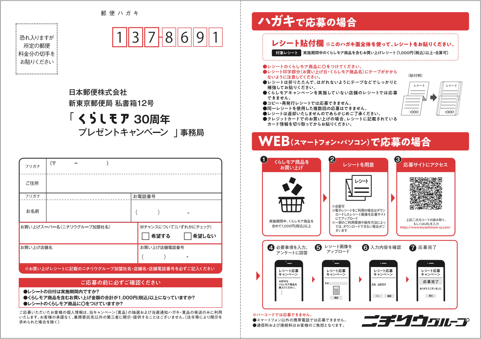 対象店舗(ニチリウグループ対象店舗) で対象商品(くらしモア商品) を1点以上含む合計1,000円(税込)以上購入したレシートでハガキまたはWEB応募できます。