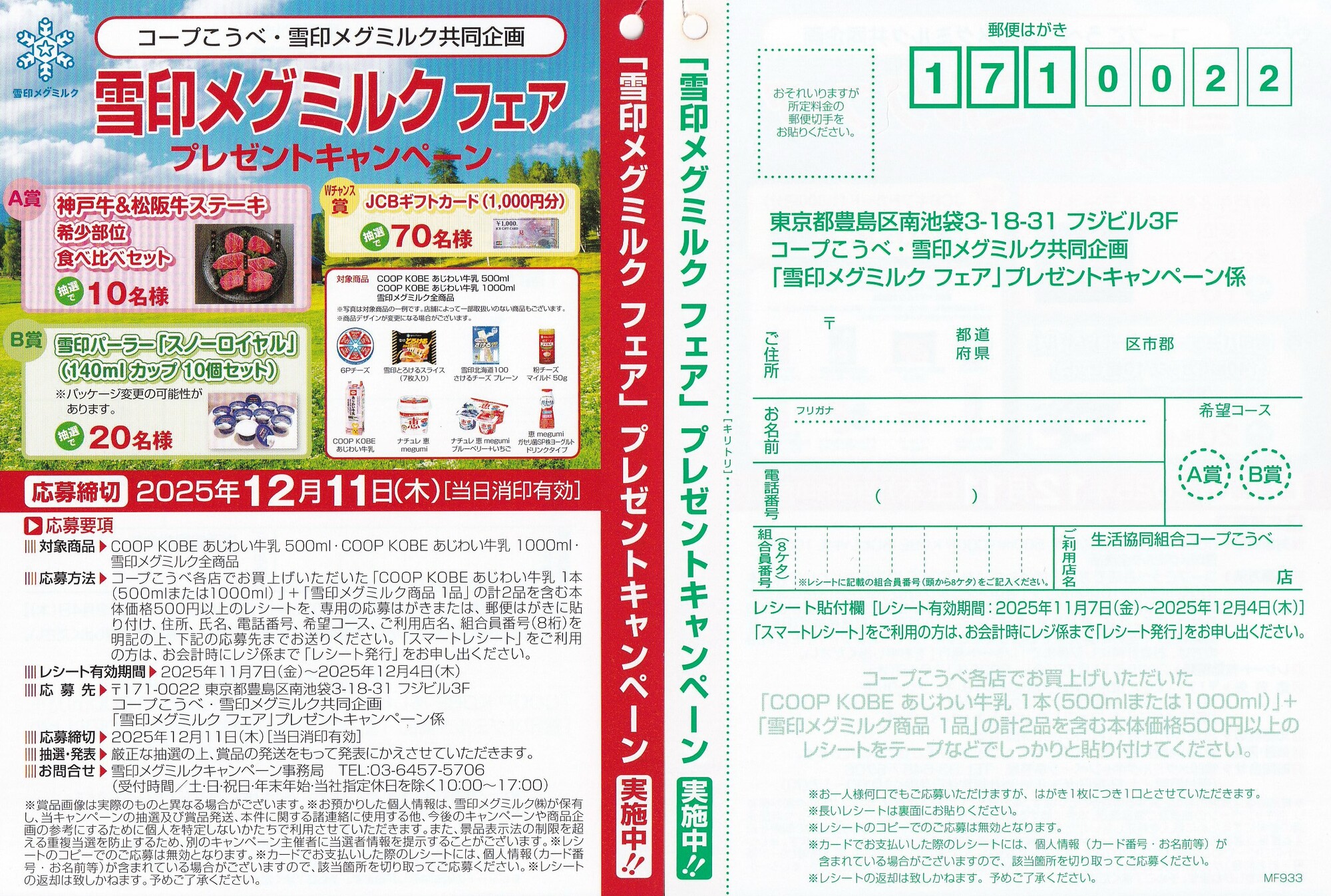 対象店舗(コープこうべ) で対象商品(COOP KOBE あじわい牛乳+雪印メグミルク全商品) を各1点づつ(合計2点)を含む合計500円(税抜)以上購入したレシートでハガキ応募できます。
