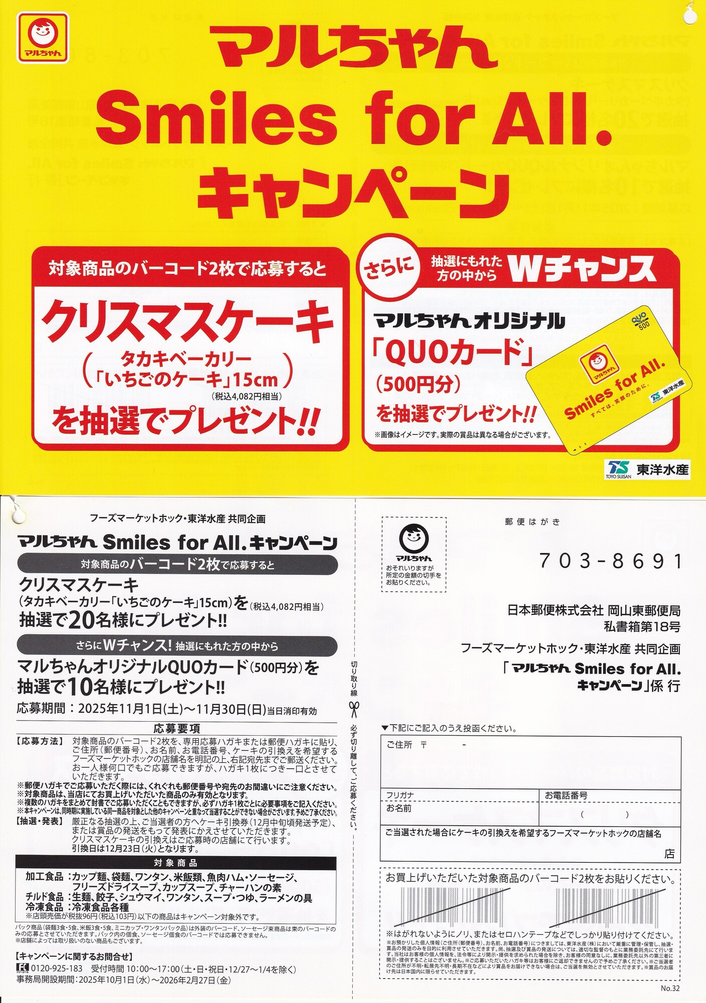 フーズマーケットホック×東洋水産 共同企画のクローズド懸賞「マルちゃん Smiles for AIl. キャンペーン」のご紹介です。
