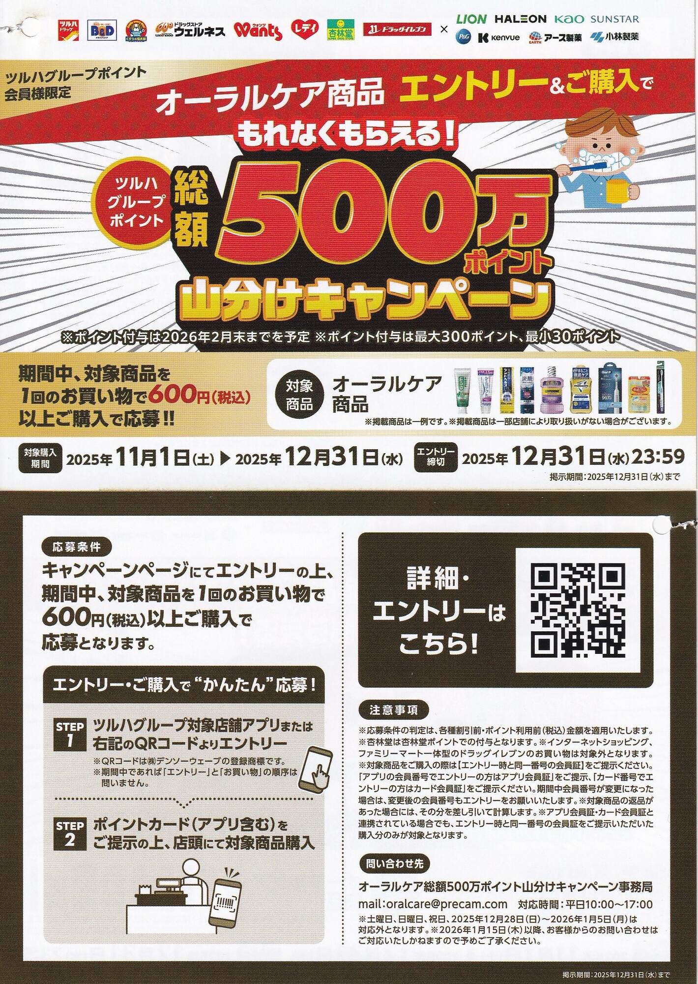 対象店舗(ツルハグループ) で対象商品(オーラルケア商品) を1会計で600円(税込)以上会員証提示購入&エントリーで応募できます。