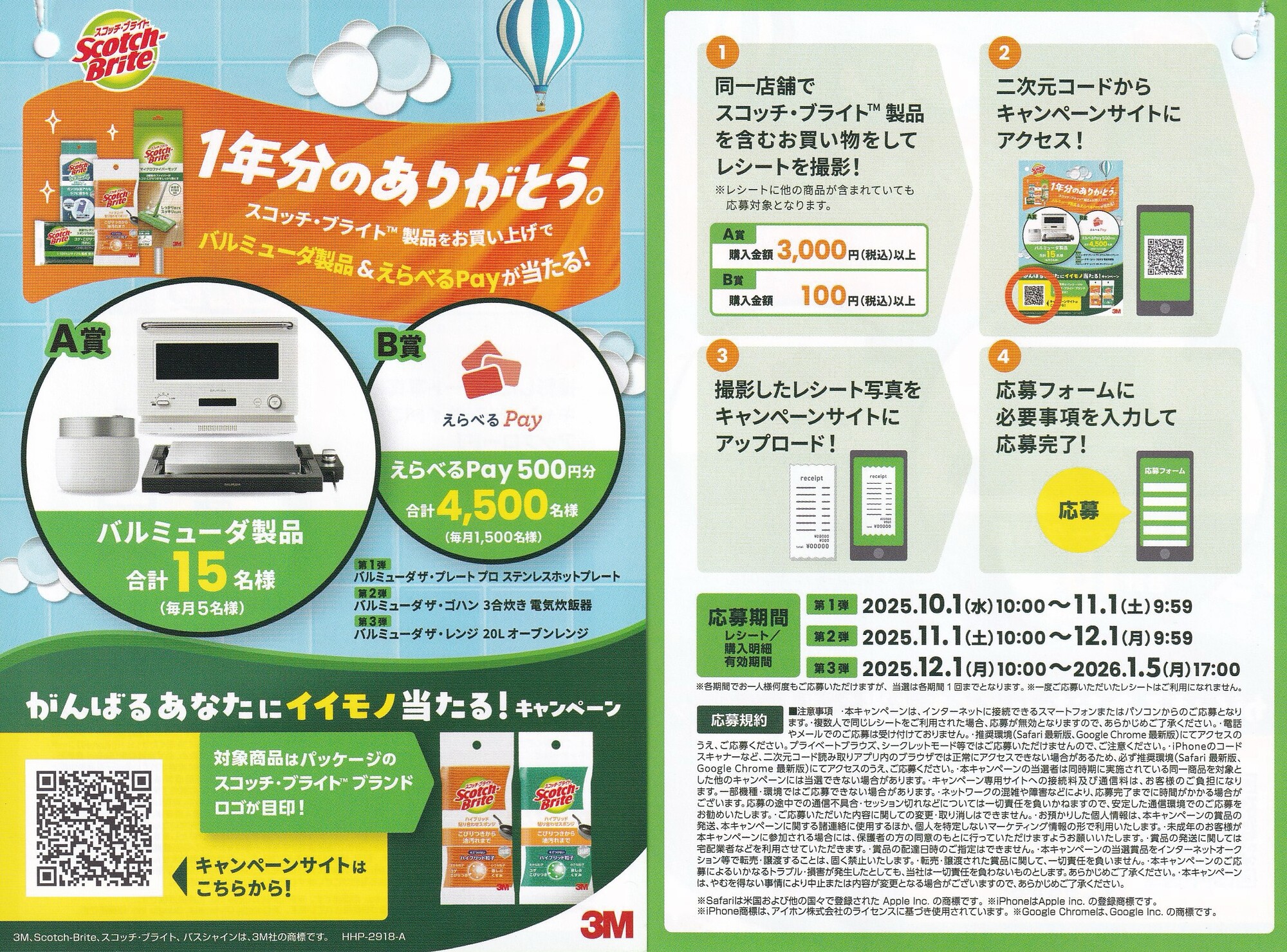 対象商品(スコッチ・ブライト 全製品) を1点以上含む合計必要金額以上購入したレシートでWEB応募できます。