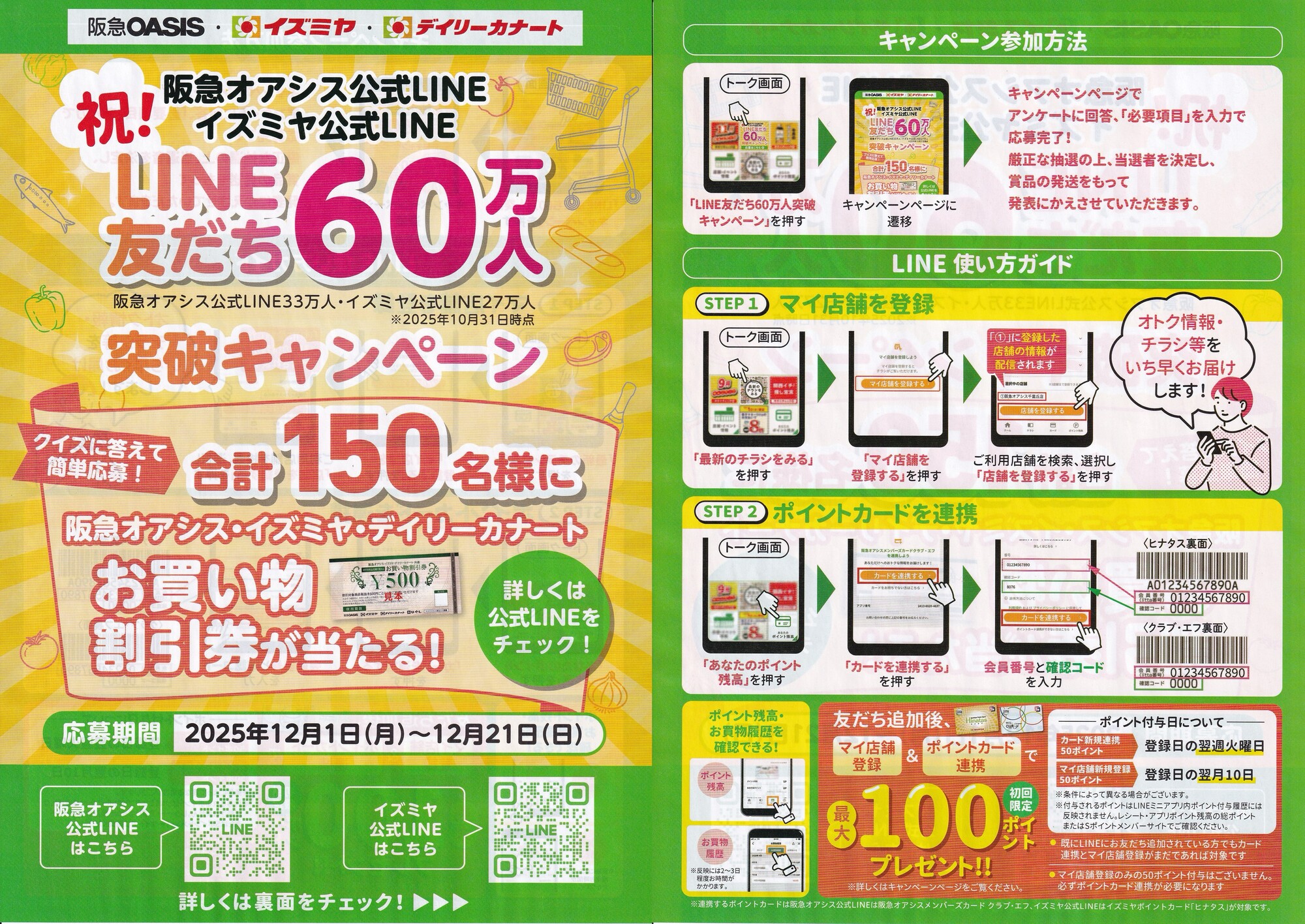 阪急オアシス・イズミヤの懸賞「阪急オアシス公式LINE イズミヤ公式LINE 祝!LINE友だち60万人突破キャンペーン」のご紹介です。