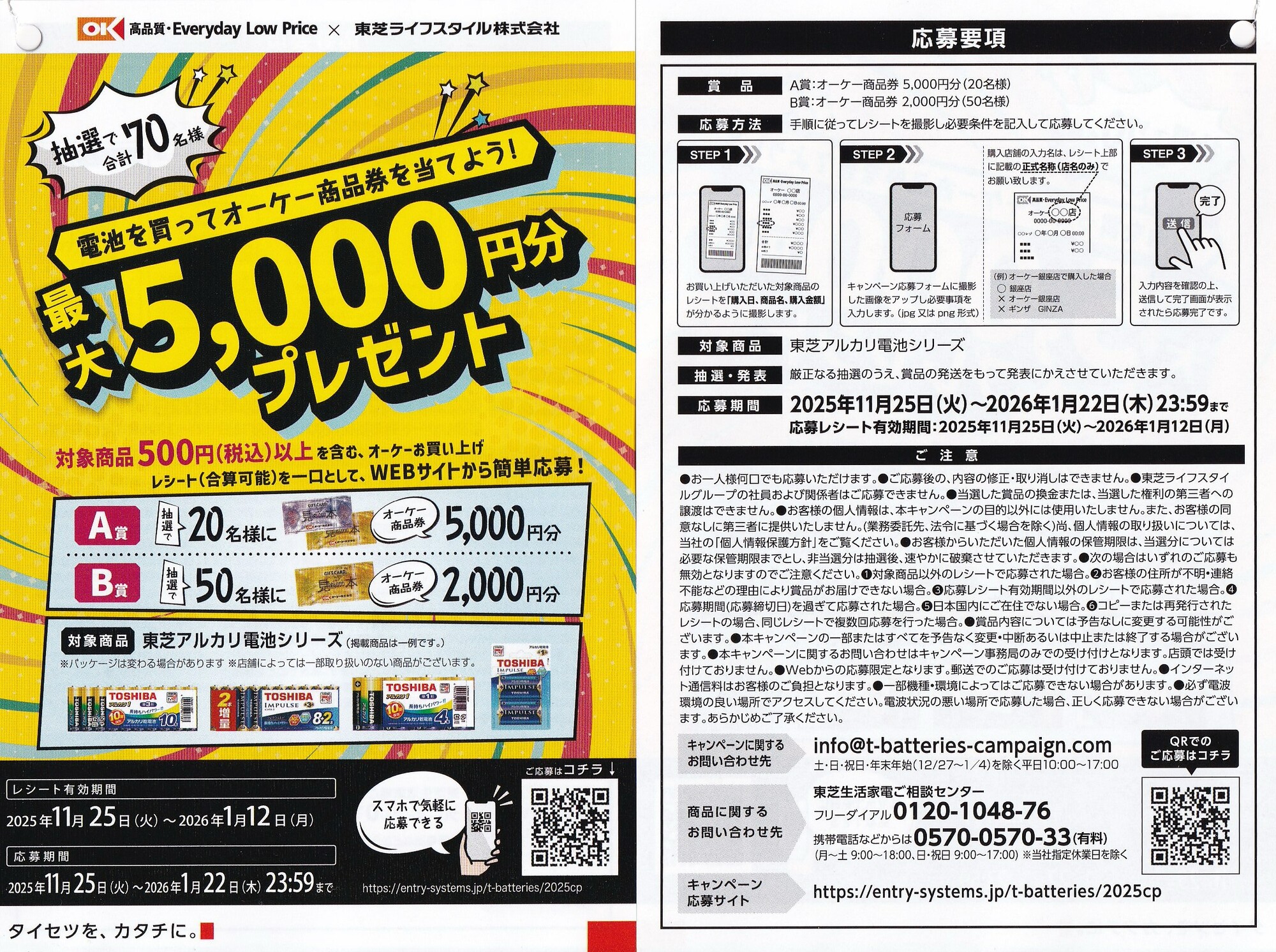 対象店舗(オーケー)で対象商品(東芝アルカリ電池) を500円(税込) 以上購入したレシートでWEB応募できます。