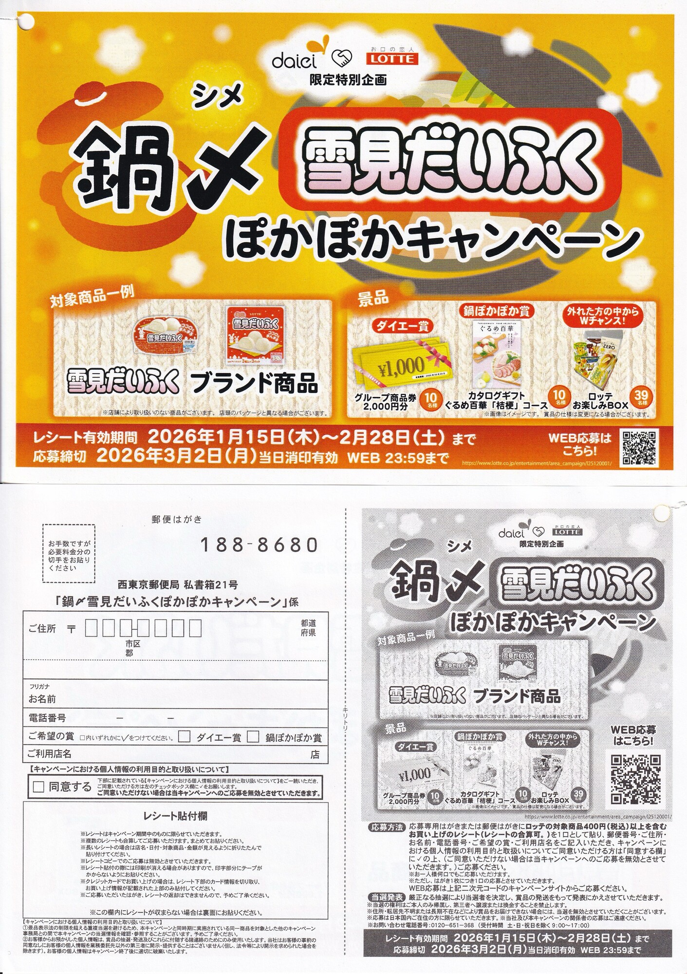 ダイエー×ロッテのクローズド懸賞「鍋〆雪見だいふくぽかぽかキャンペーン」のご紹介です。