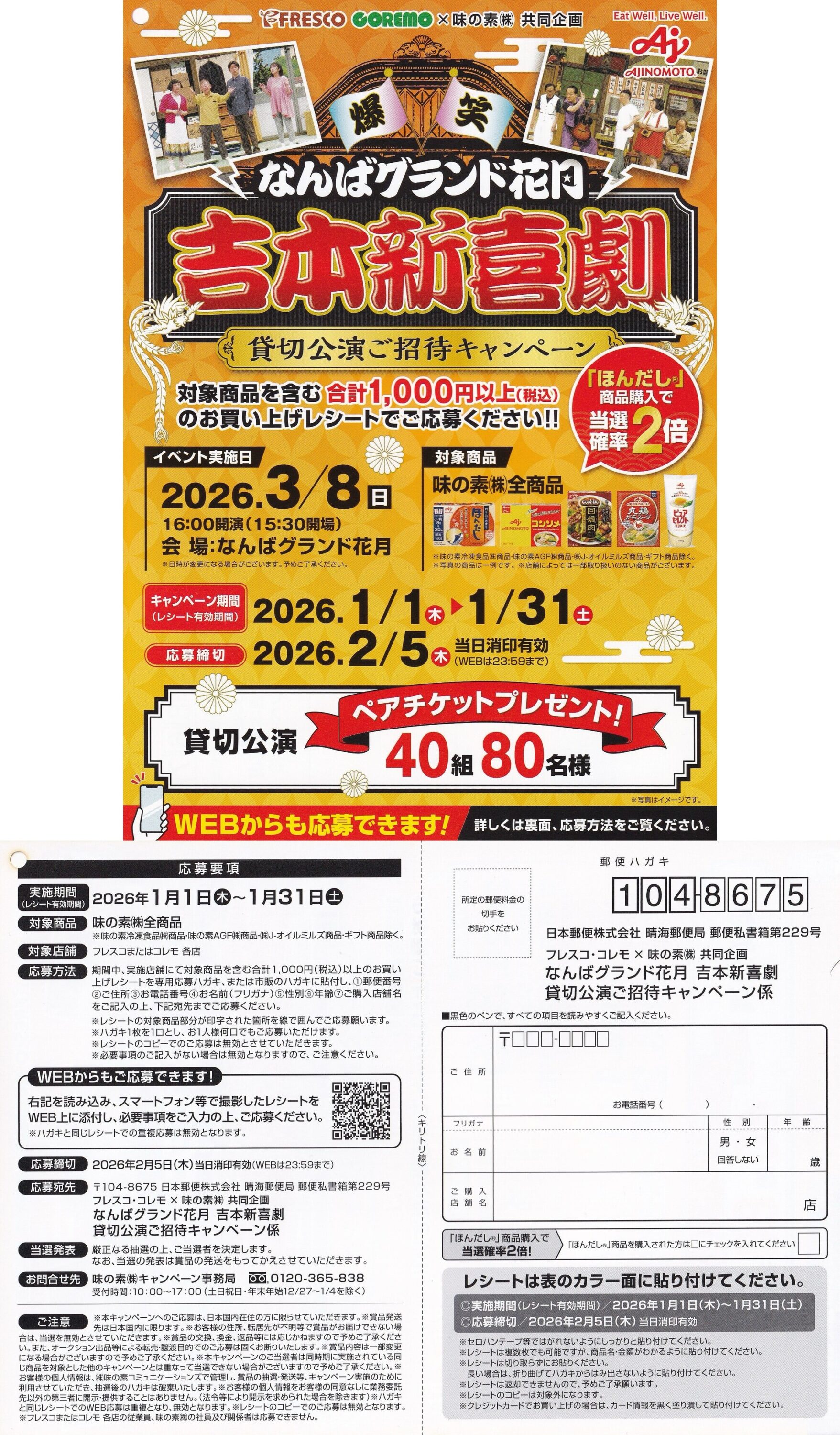 フレスコ×味の素のよしもとが当たるクローズド懸賞情報です。