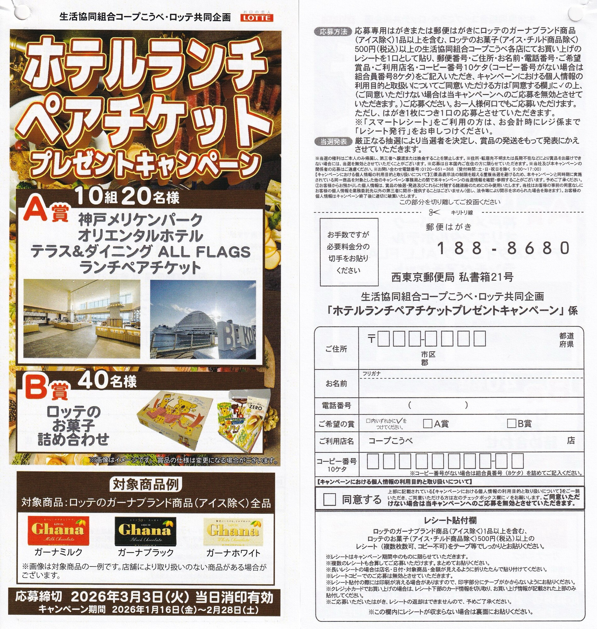対象店舗(コープこうべ) でロッテ ガーナブランド商品を1点以上含むロッテのお菓子を500円(税込) 以上購入したレシートでハガキ応募できます。