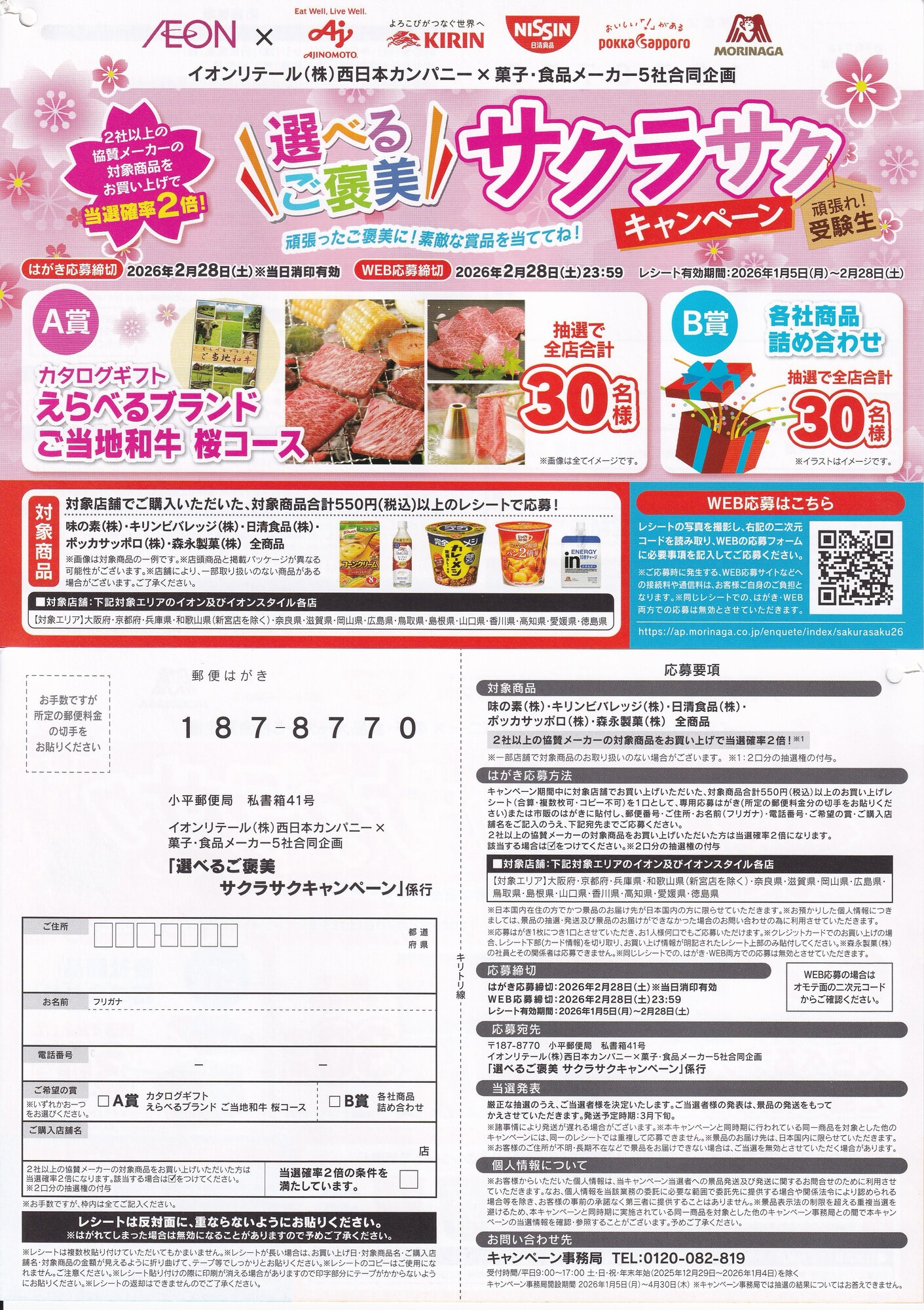 イオンリテール西日本×菓子・食品メーカー5社 選べるご褒美 サクラサクキャンペーン 懸賞ハガキ