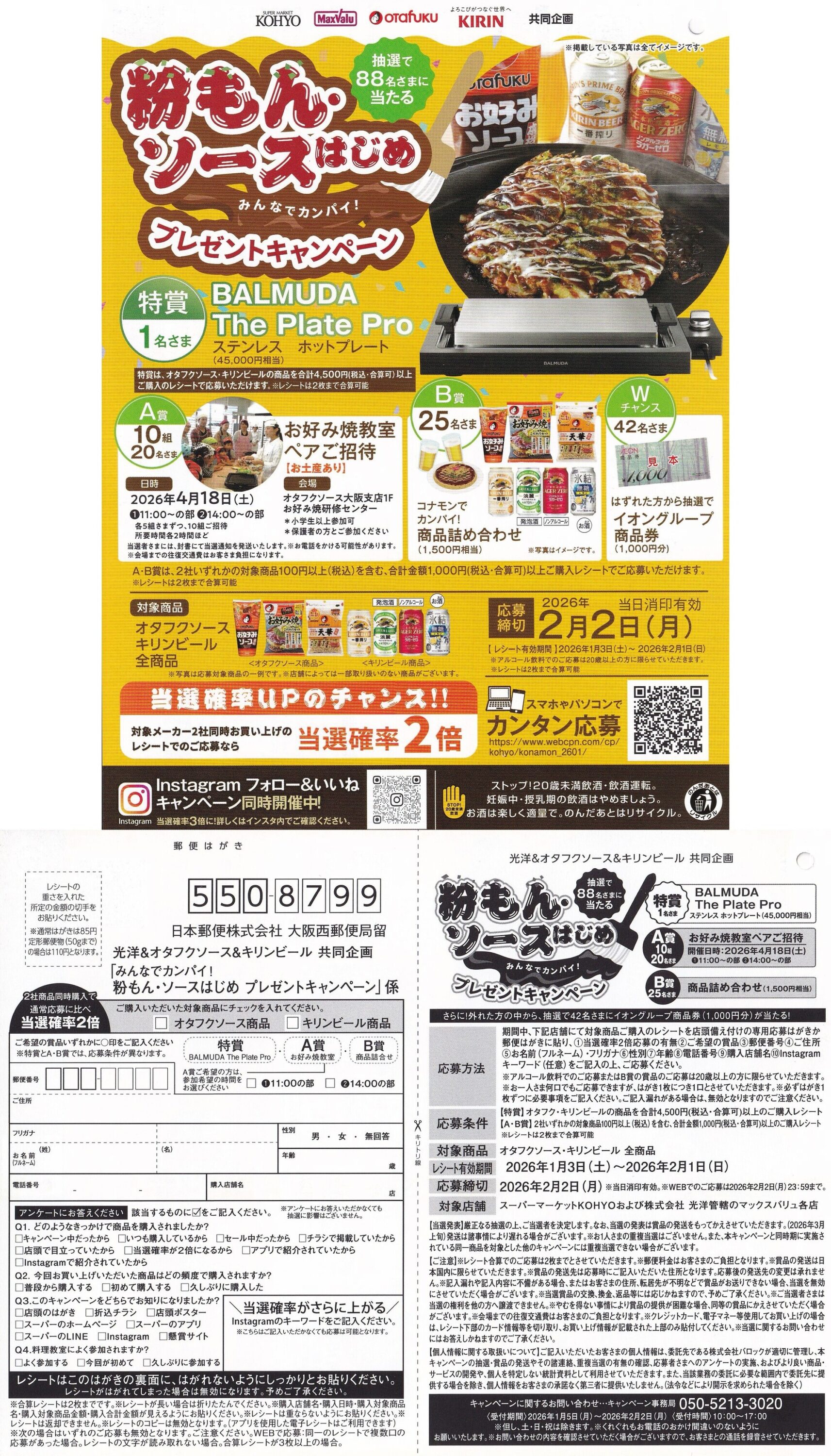 対象店舗(光洋)で対象商品(オタフクソース・キリンビール全商品) を必要金額購入したレシートでWEBまたはハガキ応募できます。