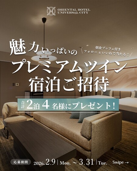オリエンタルホテル ユニバーサル・シティのInstagram懸賞「魅力いっぱいの朝食ブッフェ付きプレミアムツイン宿泊ご招待キャンペーン」のご紹介です。