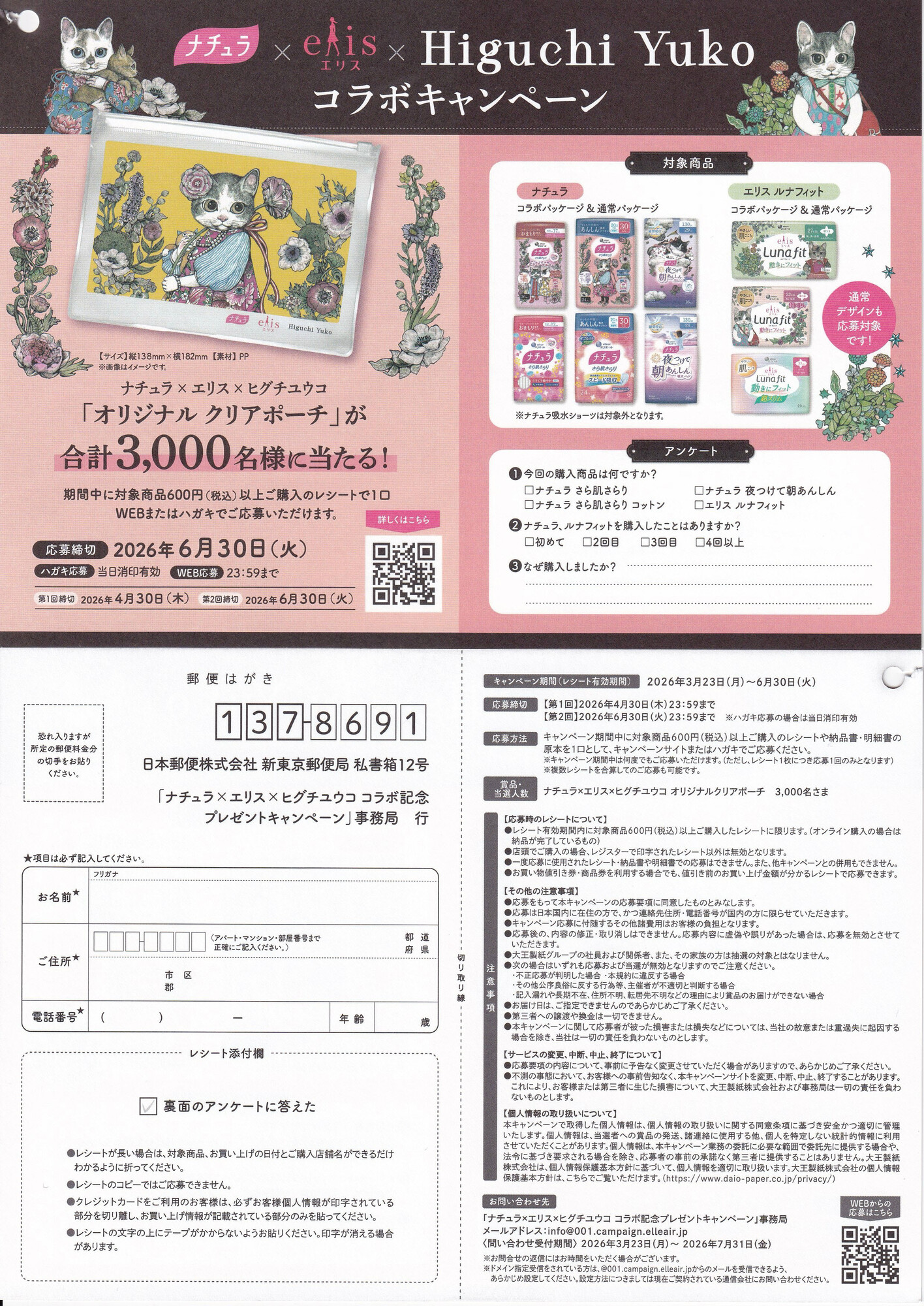 対象商品(ナチュラ、エリス 対象商品) を600円(税込)以上購入したレシートでWEBまたはハガキ応募できます。