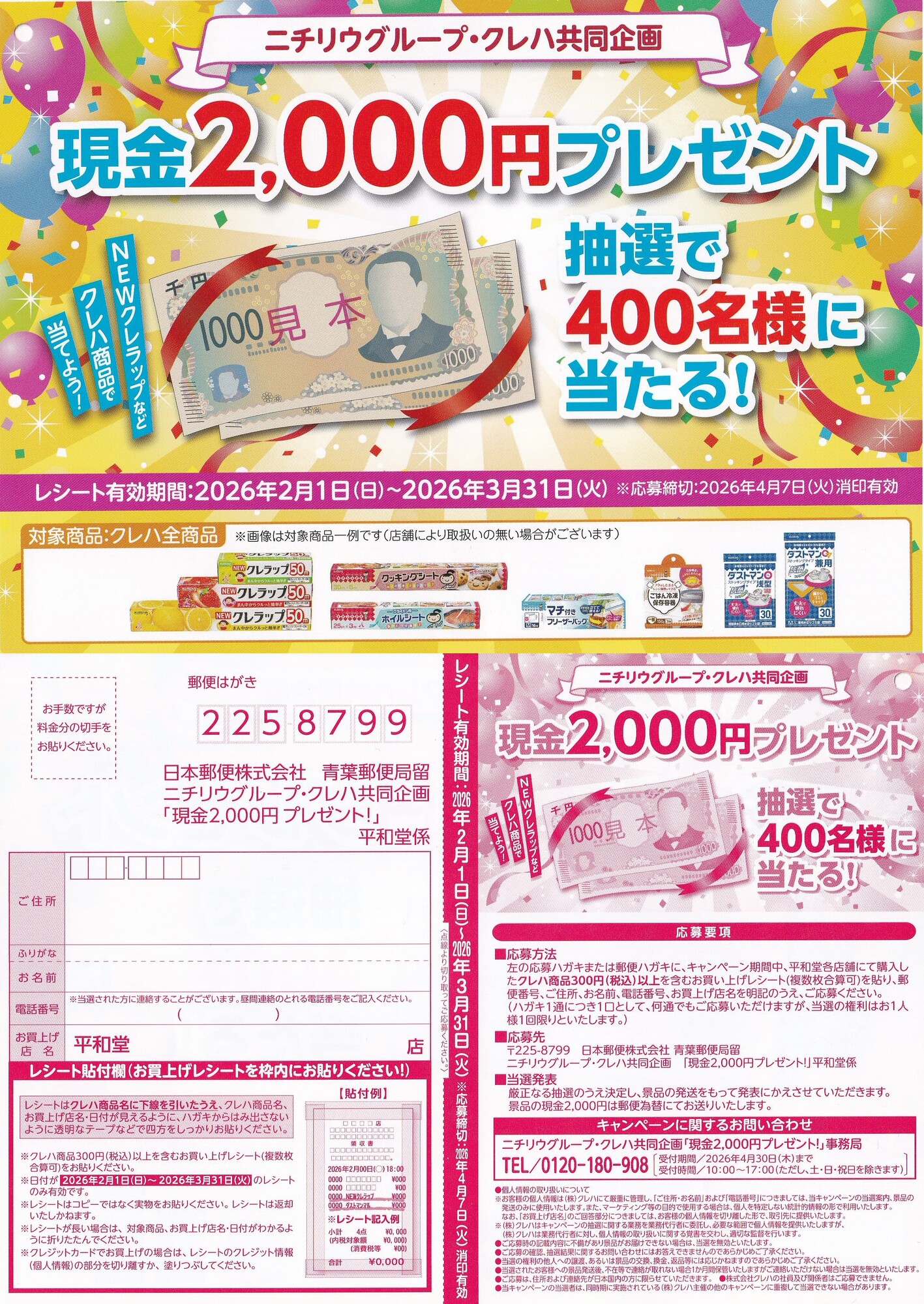 現金2,000円が400名様に当たる!「ニチリウグループ・クレハ共同企画 現金2,000円プレゼント!」キャンペーンのご紹介。