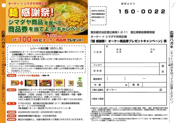 オーケー×シマダヤのクローズド懸賞「麺感謝祭!オーケー商品券プレゼントキャンペーン」のご紹介です。
