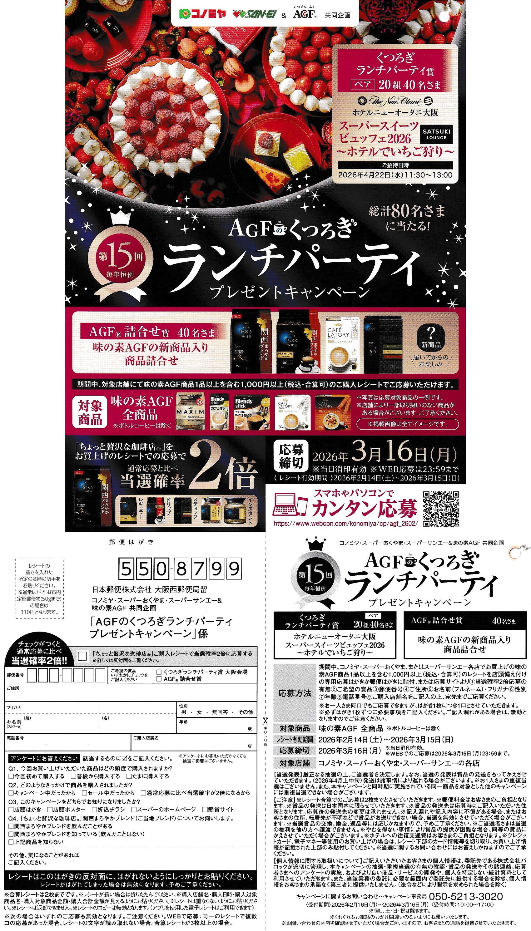 対象店舗(コノミヤ、スーパーおくやま、スーパーサンエー)で対象商品(味の素AGF 全商品) を1点以上含む合計1,000円(税込)以上購入したレシートでWEBまたはハガキ応募できます。