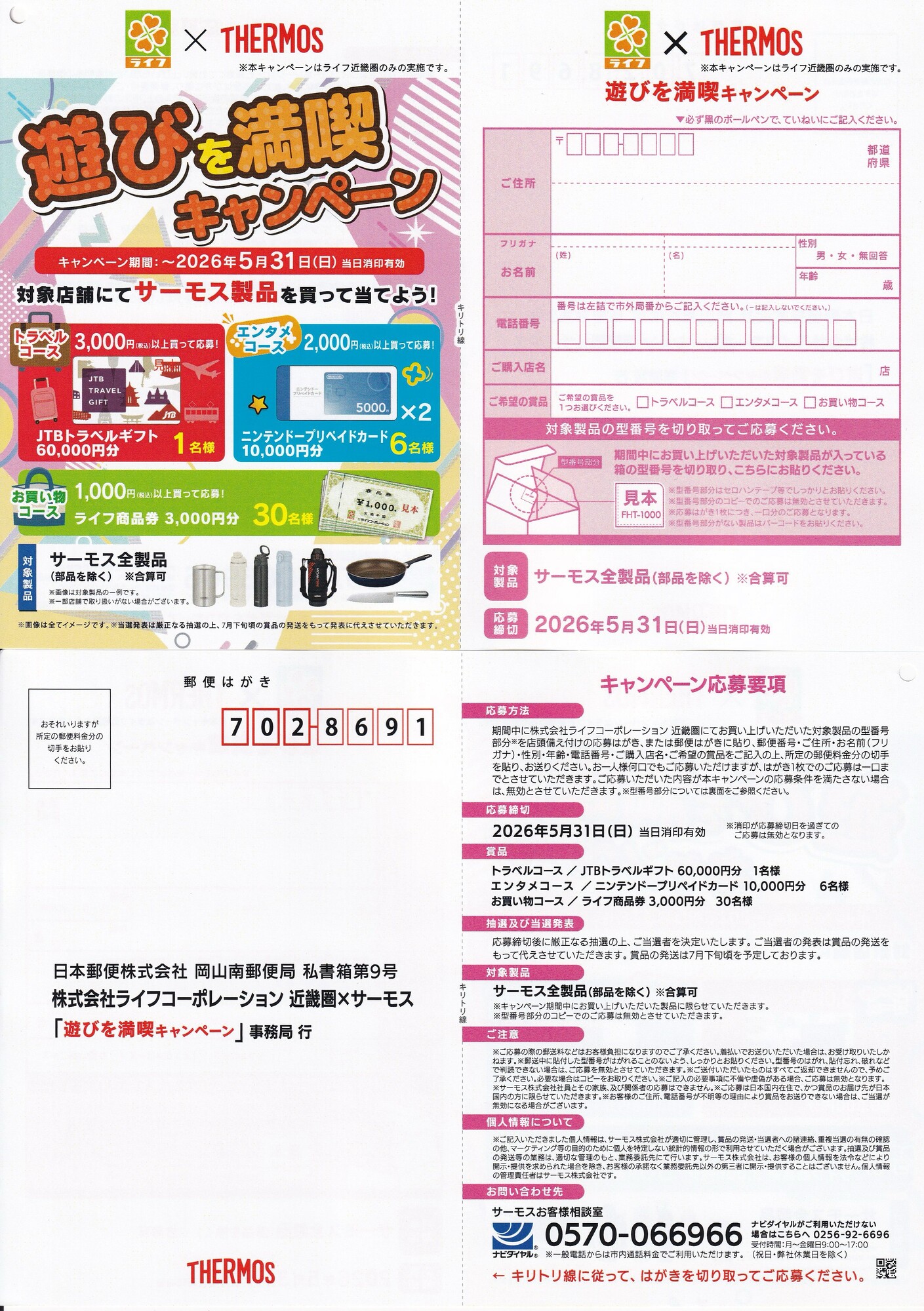 ライフ近畿圏×サーモス 遊びを満喫キャンペーン 懸賞ハガキ