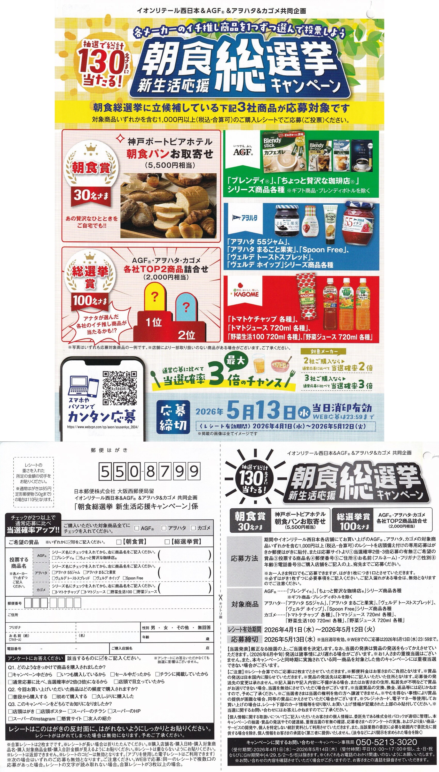 イオンリテール西日本×味の素AGF×アヲハタ×カゴメのクローズド懸賞「朝食総選挙 新生活応援キャンペーン」のご紹介です。