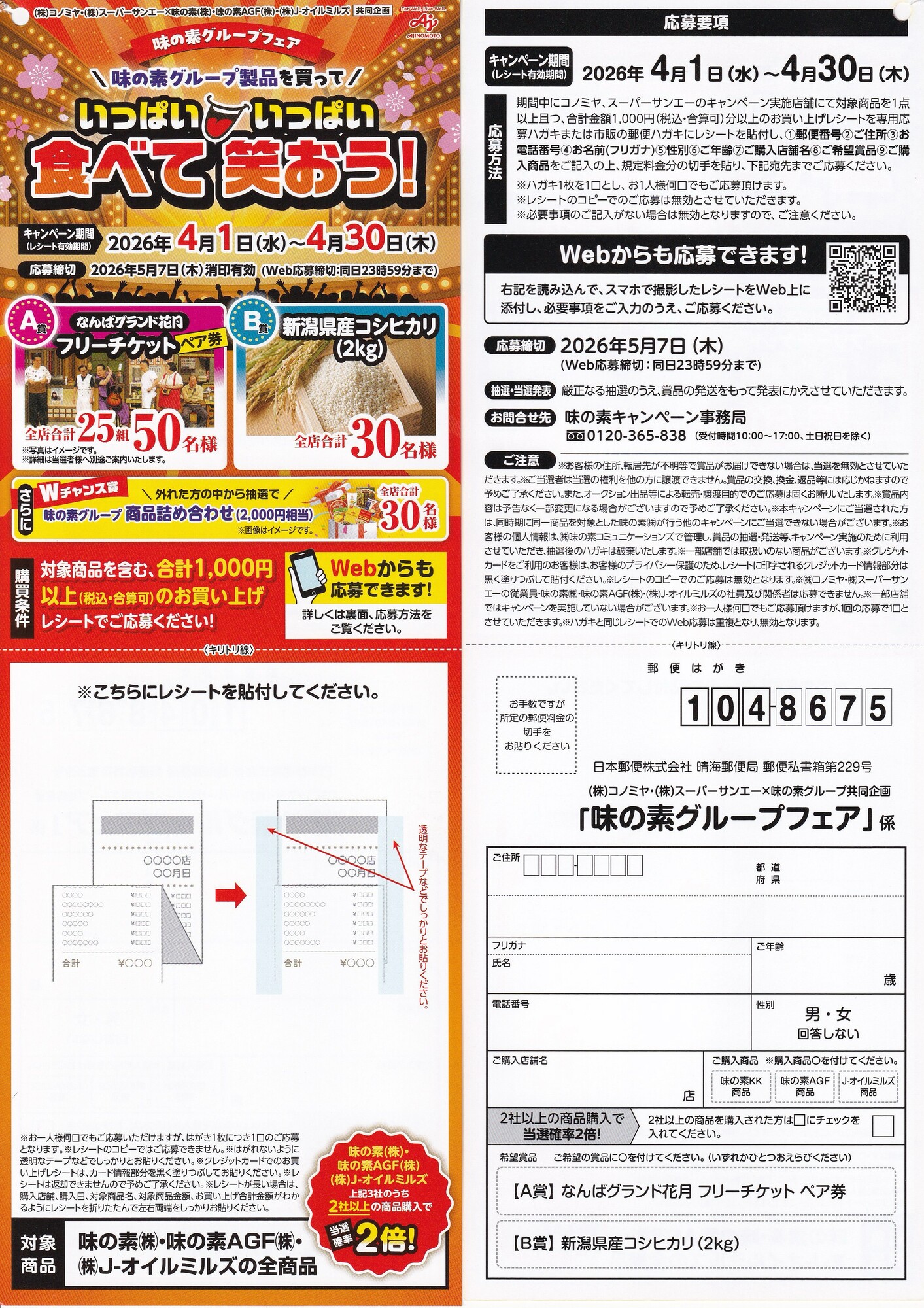 対象店舗(コノミヤ、サンエー) で対象商品(味の素・味の素AGF・J-オイルミルズ 全商品) を1点以上含む合計1,000円(税込)以上購入したレシートでWEBまたはハガキ応募できます。
