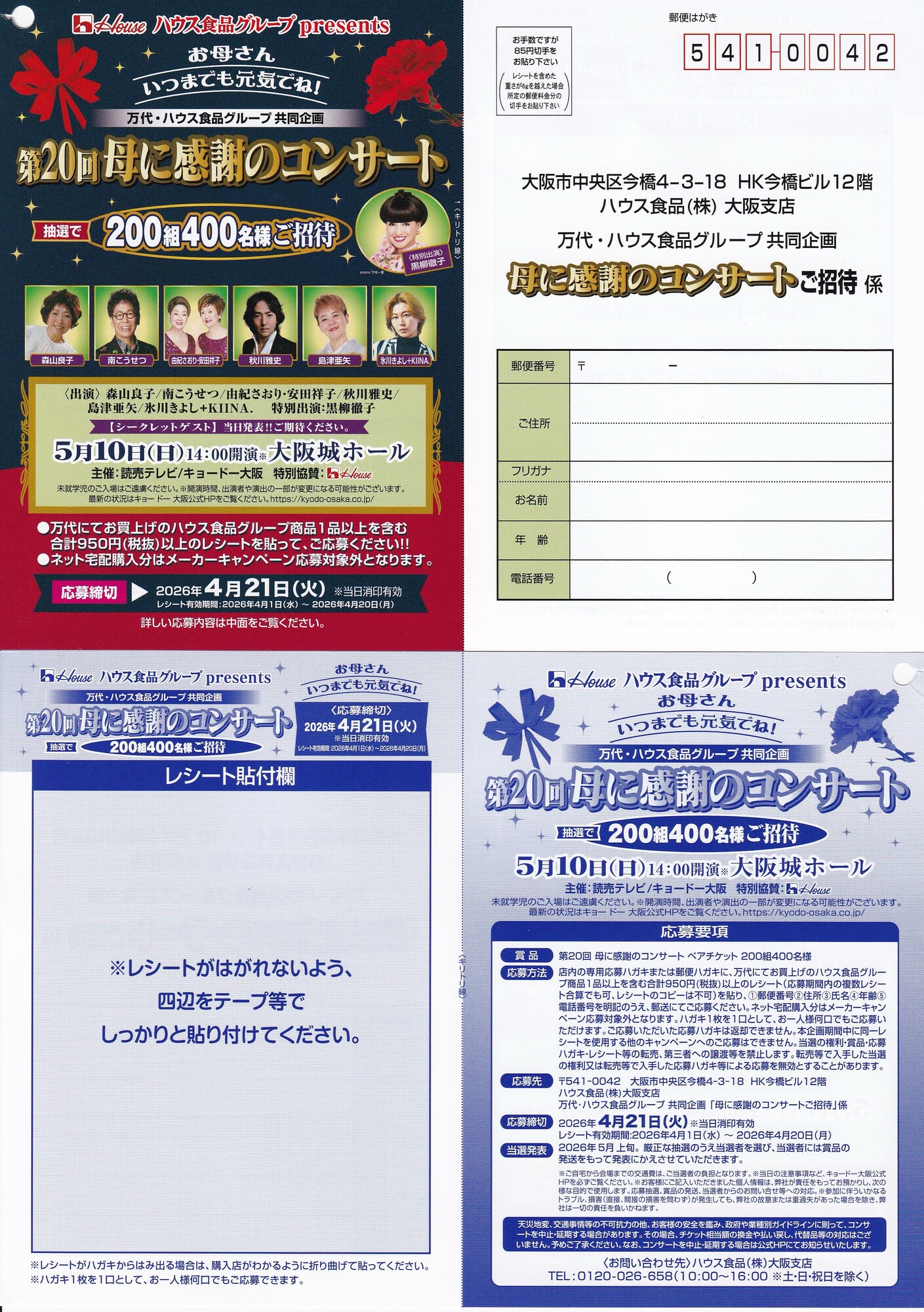 万代×ハウス食品グループのクローズド懸賞「第20回 母に感謝のコンサートご招待」キャンペーンのご紹介です。