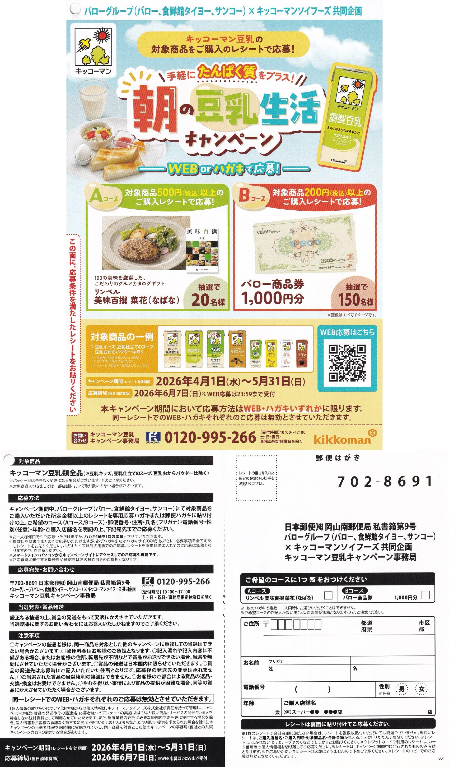 バロー×キッコーマンソイフーズ 朝の豆乳生活キャンペーン 懸賞ハガキ