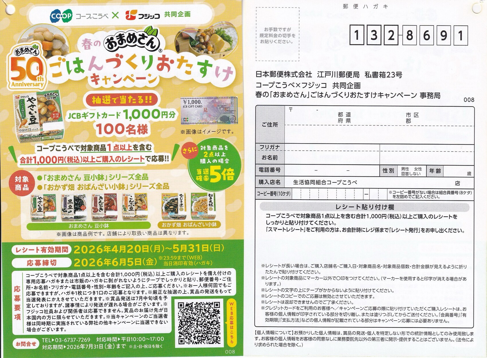対象店舗(コープこうべ)で対象商品(フジッコ 対象商品) を1点以上含む合計1,000円(税込)以上購入したレシートでWEBまたはハガキ応募できます。