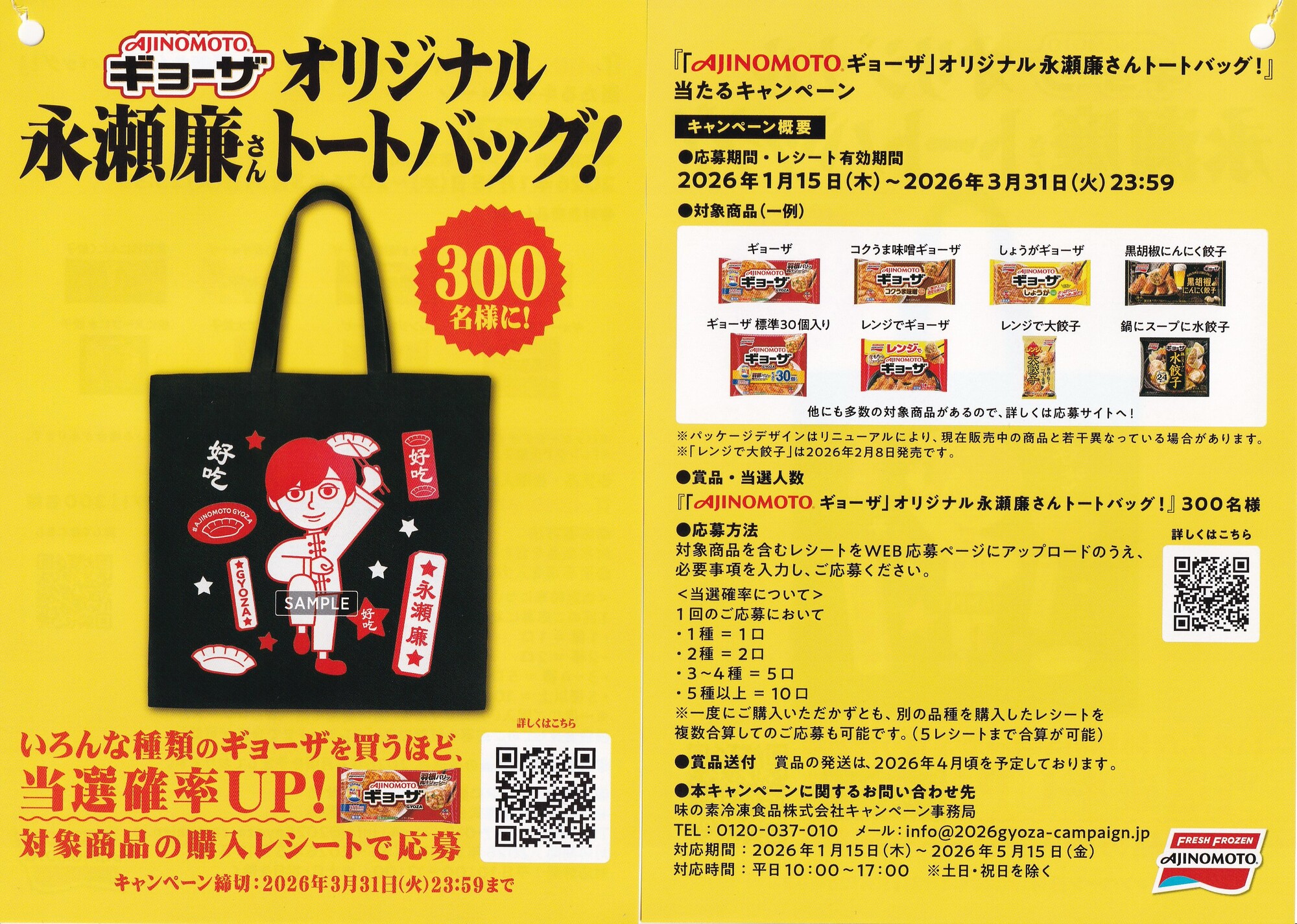 「AJINOMOTO BRANDギョーザ」オリジナル永瀬廉さんトートバッグ!当たるキャンペーン 懸賞チラシ