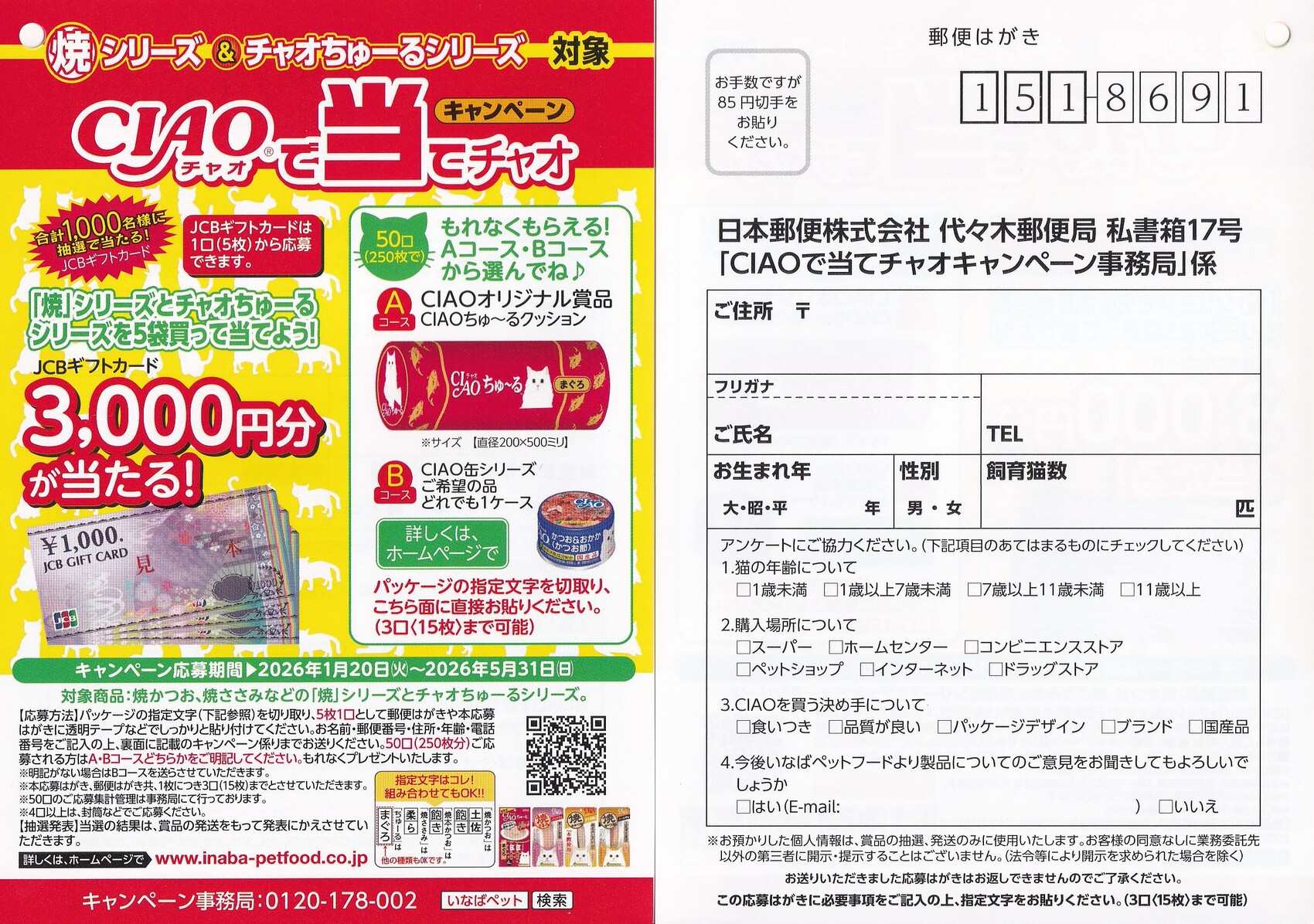 いなばペットフード チャオちゅ〜る CIAOで当てチャオキャンペーン 懸賞ハガキ