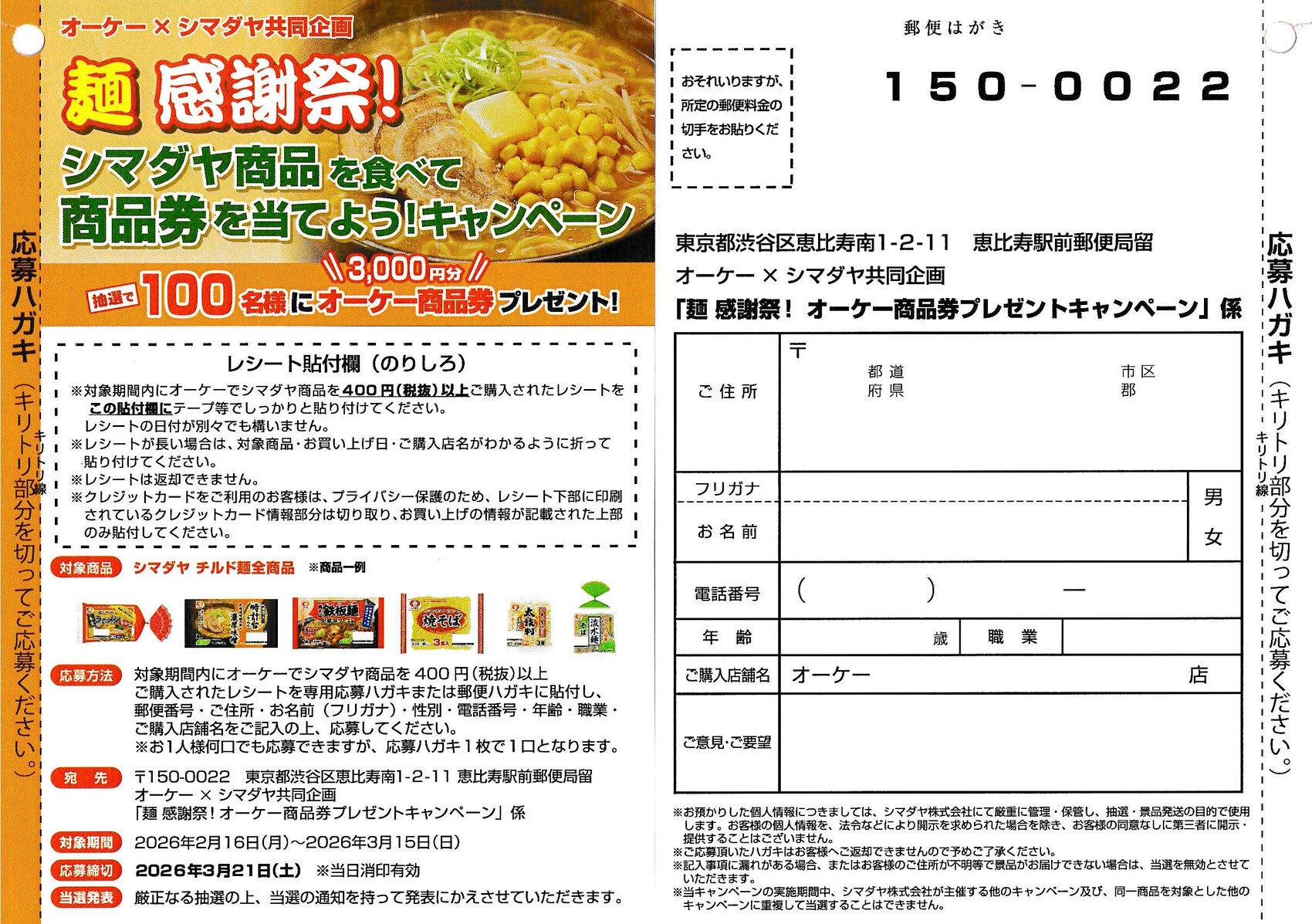 オーケー×シマダヤの懸賞「麺感謝祭!オーケー商品券プレゼントキャンペーン」